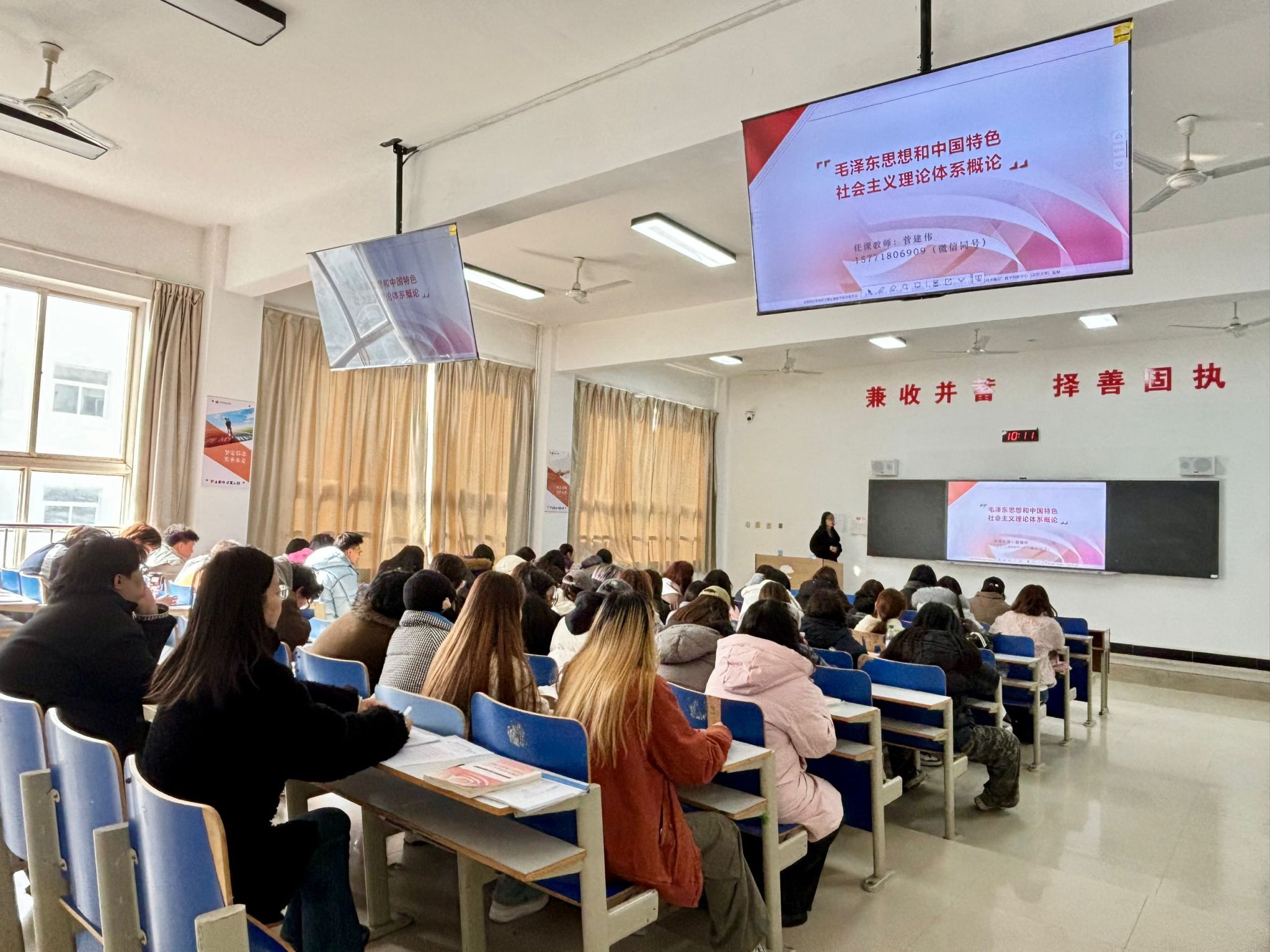 (侯帆)为深入贯彻落实立德树人根本任务,扎实推进思想政治理论课改革创新,全面掌握新学期教学运行状态,2025-2026学年第二学期开学伊始,马克思主义学院副院长朱旭带领教研室主任深入教学一线,开展开学第一课集中听课活动,重点听取《毛泽东思想和中国特色社会主义理论体系概论》《中国近现代史纲要》等核心思政课程,以实地听课、现场观摩、课后交流的方式,把脉课堂教学、指导育人实践。