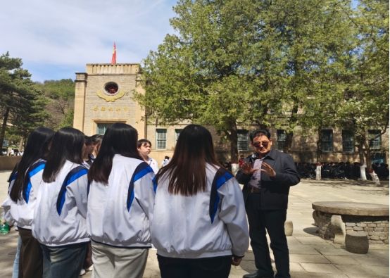 4月11日,研学队伍走进杨家岭革命旧址,这里曾是党中央领导中国革命、推进理论创新的重要阵地。在中共七大会址前,马克思主义学院颜毓洁院长结合《概论》课程核心知识点,为全体学生上了一堂生动的实景思政课。颜院长围绕中共七大的历史意义、毛泽东思想在七大上被确立为党的指导思想的深刻内涵,结合旧址内的历史遗存,用通俗的语言、鲜活的案例,讲解了“实事求是、独立自主”的延安精神内核,引导同学们思考“党的理论如何在实践中不断丰富发展”“当代青年如何传承革命先辈的信仰力量”。他强调,中共七大的召开,为中国革命胜利指明了方向,而毛泽东思想作为中国化的马克思主义,正是我们应对各种风险挑战、实现民族复兴的精神指引,希望同学们珍惜此次实践机会,在实景中感悟思想伟力,把红色基因融入青春血脉。同学们认真聆听、积极思考,不时点头回应,现场学习氛围浓厚。随后,在毛泽东、朱德等老一辈革命家旧居前,师生们驻足凝望,简陋的窑洞、朴素的陈设、泛黄的手稿,生动再现了党中央在延安十三年艰苦卓绝的奋斗历程。大家近距离感受革命先辈在物资匮乏、敌人封锁的艰难环境中,坚守信仰、探求真理、为民服务的崇高风范,让课本上抽象的理论知识,在红色现场变得可感可触、入脑入心。