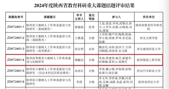(杨芝)近日,陕西省教育科学规划领导小组办公室发布《关于公布2024年度陕西省教育科研重大课题结题结果的通知》,由马克思主义学院颜毓洁院长主持的《陕西高等教育立德树人工作体系建设与实践研究》(项目编号:ZDKT2401-4)顺利结题并进行公示。